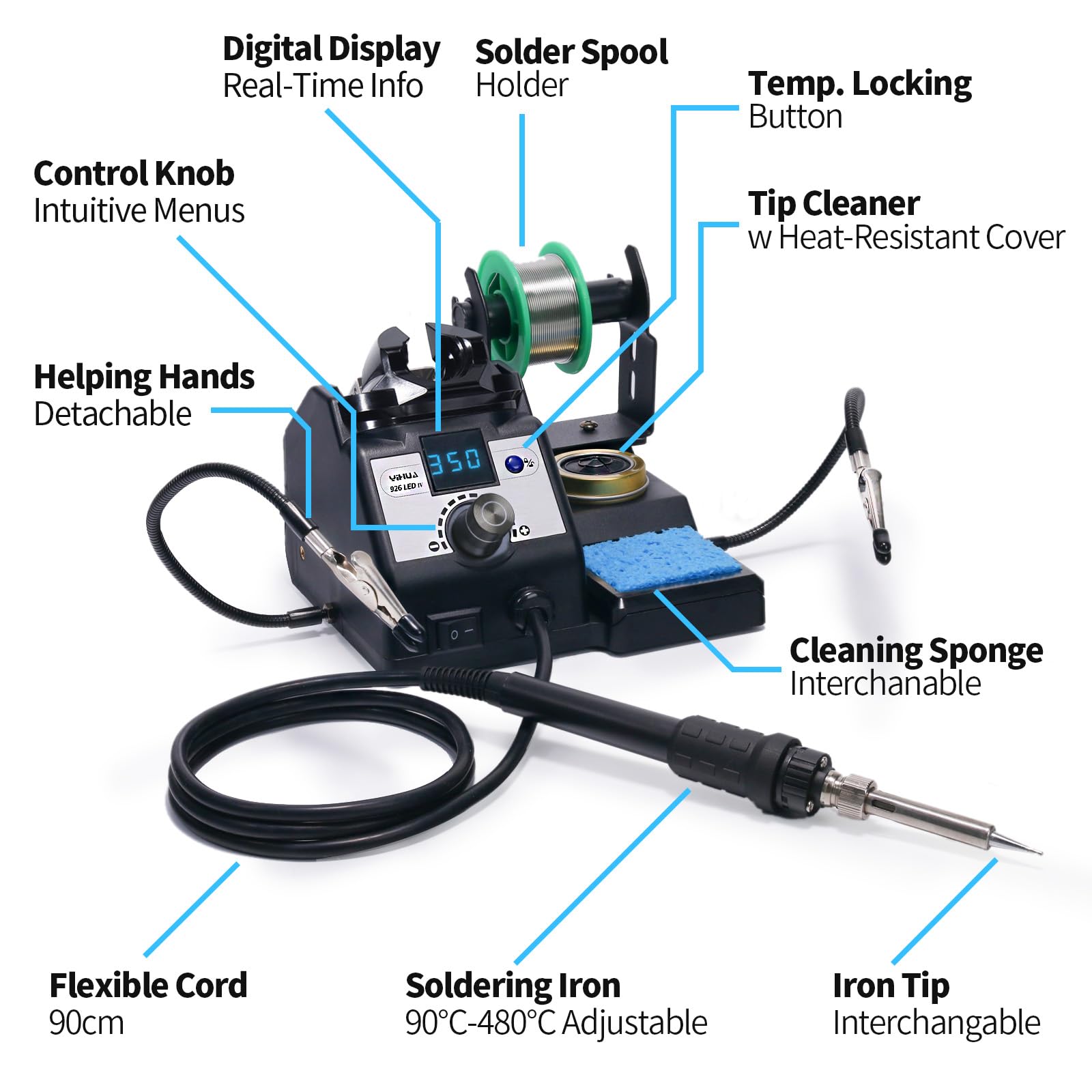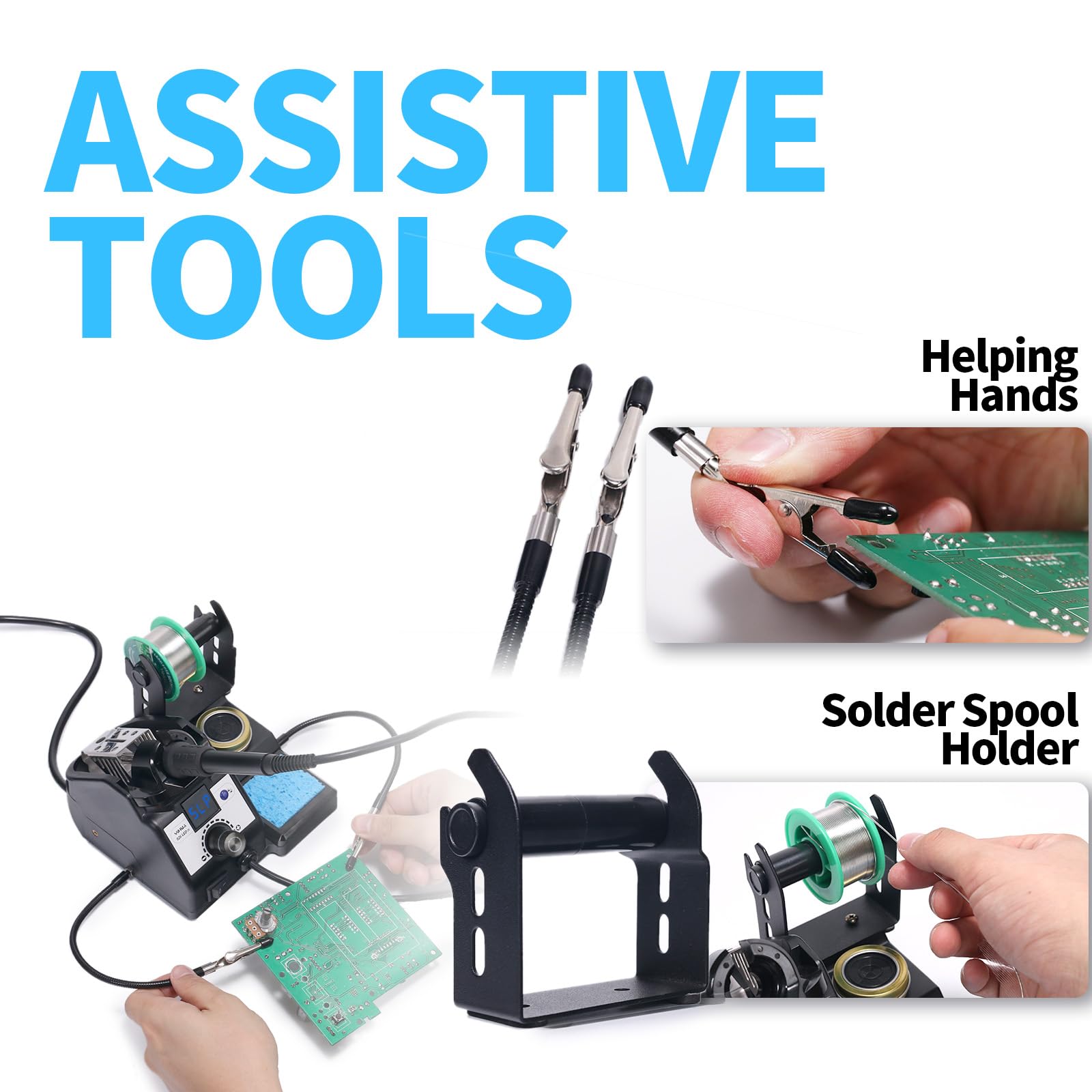 - Integrierte Helfer: Ausgestattet mit zwei flexibel anbringbaren helfenden Händen, einem seitlich montierbaren Lötdrahtspender sowie einem Spitzenreiniger aus Messingwolle und einem Reinigungsschwamm.