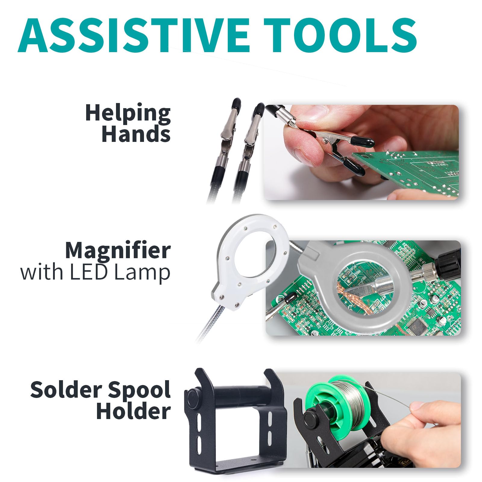 - Integriertes Zubehör: Zwei flexible "helfende Hände" und eine Lupe mit LED-Beleuchtung unterstützen Sie bei filigranen Arbeiten.