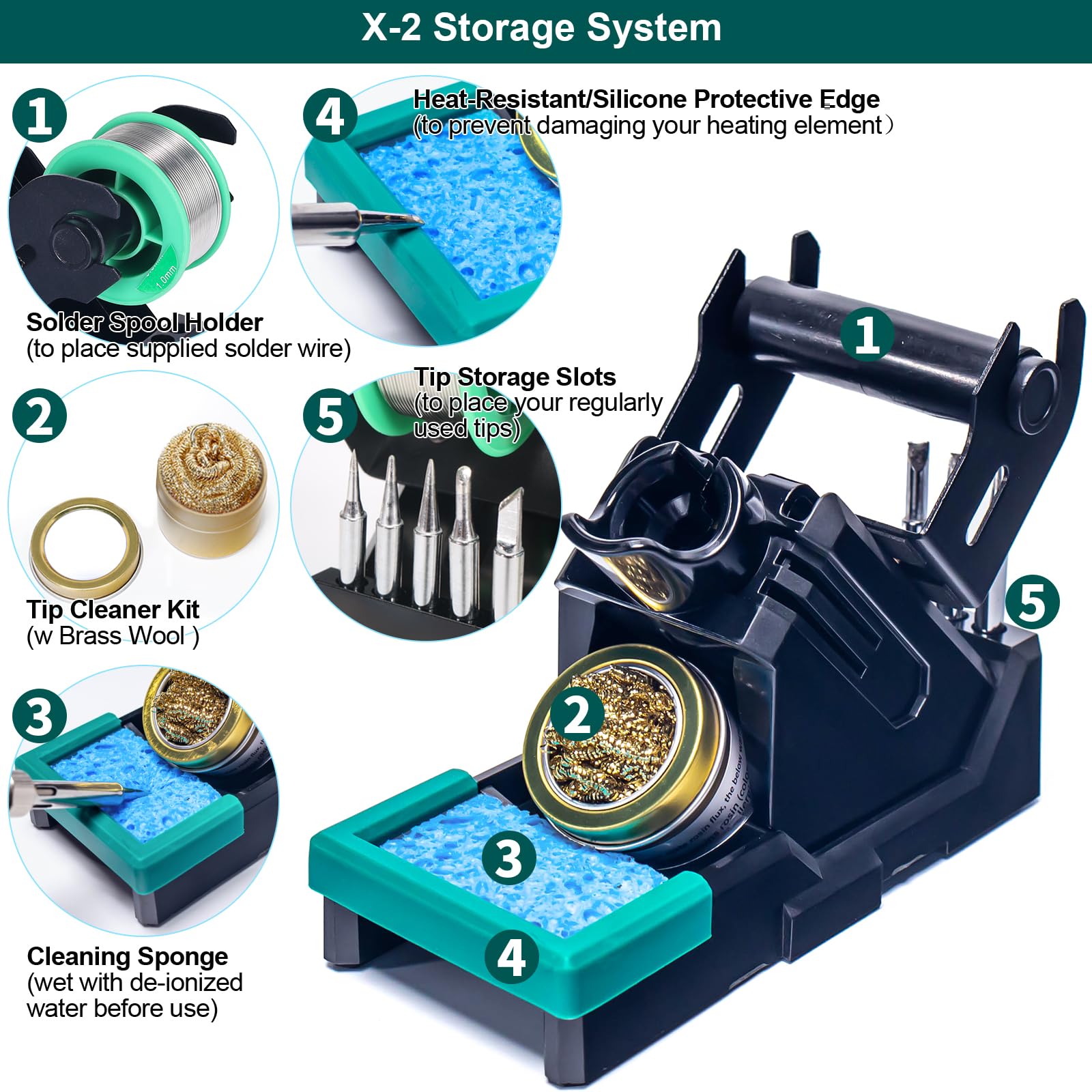 - X2-Aufbewahrungssystem: Ein multifunktionaler und stabiler Halter für Lötkolben, Reinigungsset, Lötspitzen und Lötzinnrolle sorgt für Ordnung und Sicherheit.