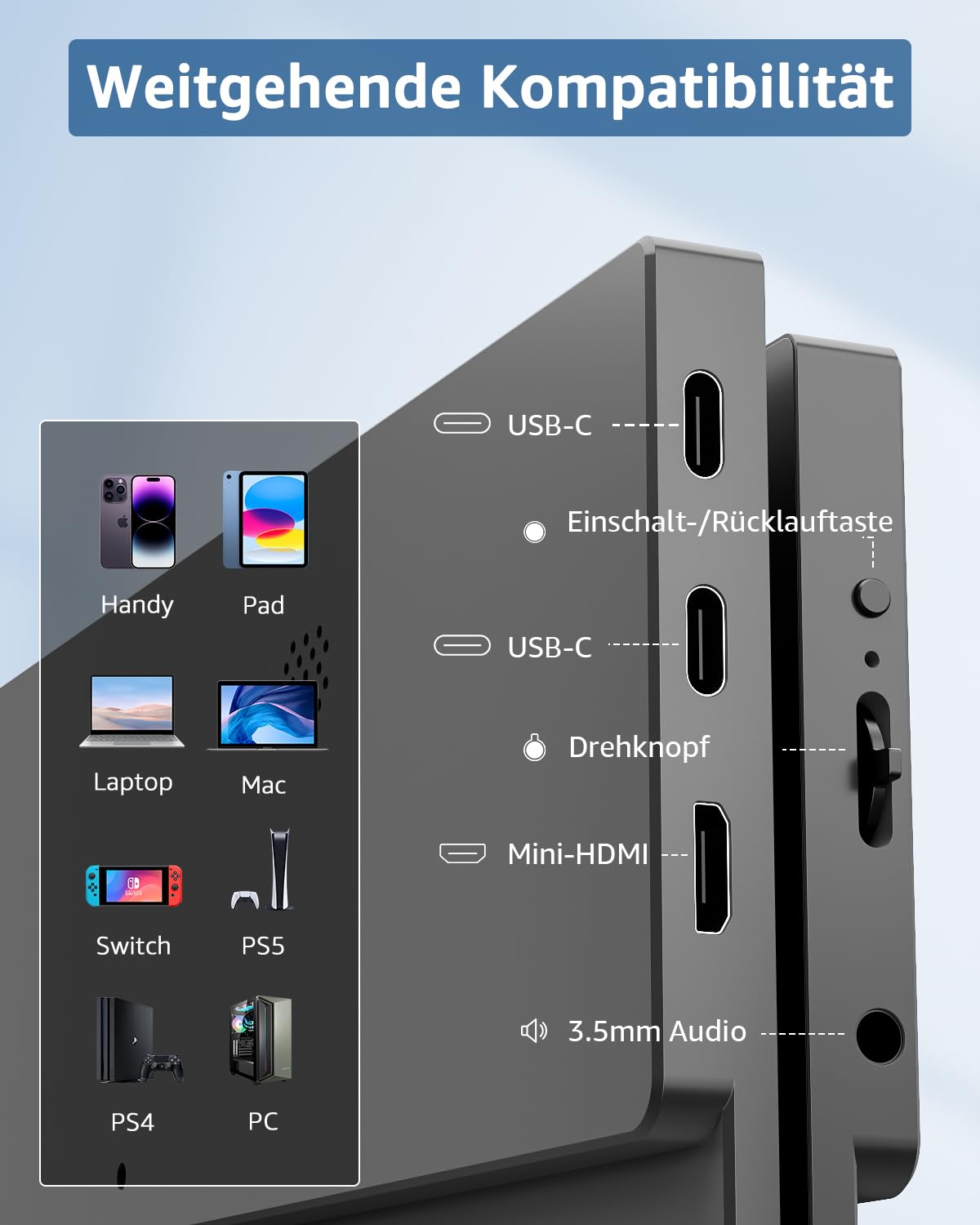 Der Monitor ist äusserst vielseitig und kann über seine zwei USB-C-Anschlüsse und den Mini-HDMI-Anschluss mühelos mit Laptops, PCs, Macs, Smartphones (die Videoausgabe über USB-C unterstützen) sowie Spielkonsolen wie Xbox oder PlayStation verbunden werden.
