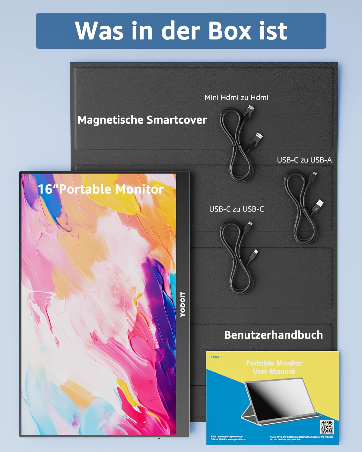Im Lieferumfang ist eine multifunktionale Schutzhülle (Smart Cover) enthalten, die auch als Ständer dient. Der Monitor verfügt zudem über eingebaute Lautsprecher. Sein 16-Zoll-Display im 16:10-Format bietet eine scharfe FHD-Auflösung (1920x1200), ein IPS-Panel für lebendige Farben und eine blendfreie Oberfläche zur Minimierung von Spiegelungen.