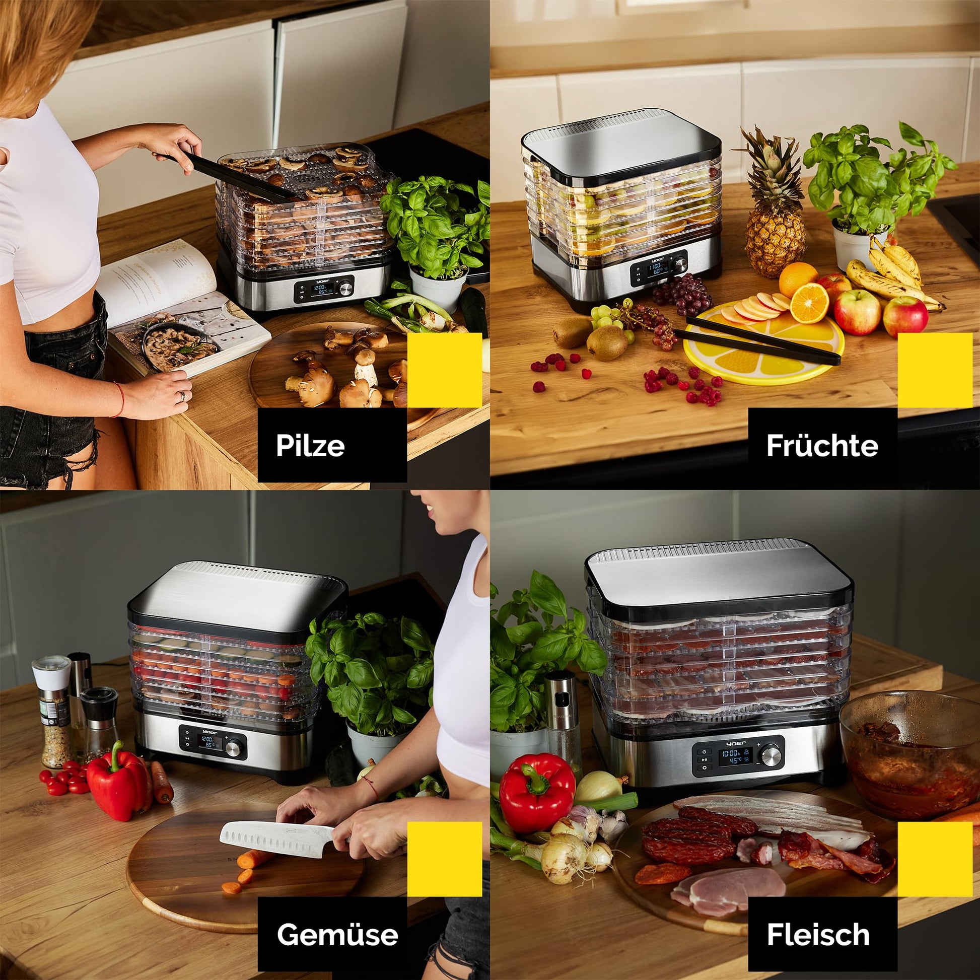 Dieses Gerät ist weit mehr als nur ein Obsttrockner. Bereiten Sie mühelos Trockenfleisch (Beef Jerky), knackiges Gemüse, aromatische Kräuter, selbstgemachte Müesliriegel oder feines Fruchtleder zu. Ihrer Kreativität in der Küche sind keine Grenzen gesetzt.