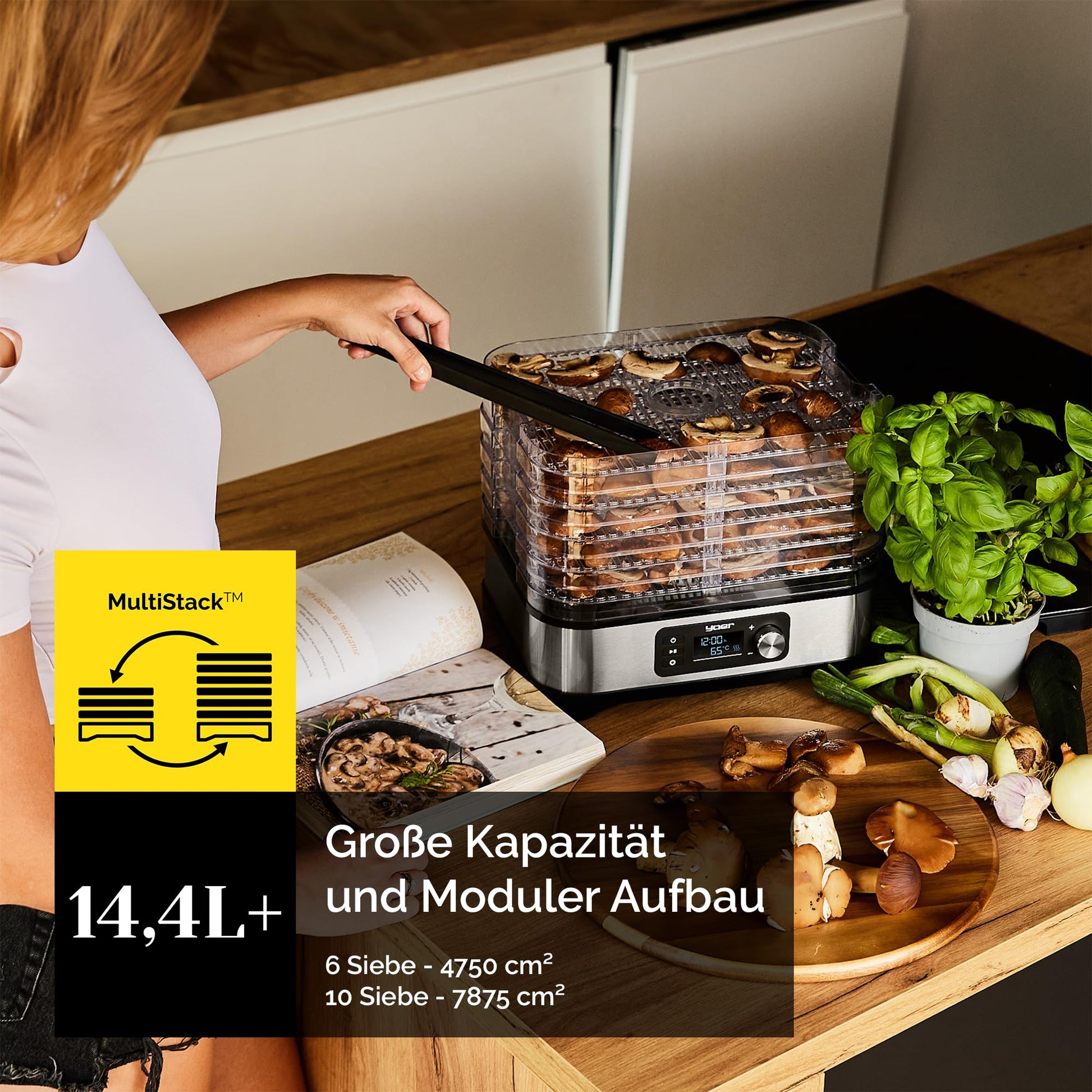 Das Gerät bietet mit sechs Etagen eine sehr grosse Trocknungsfläche von insgesamt 4725 cm², ideal für die Verarbeitung grösserer Mengen auf einmal. Sie haben die volle Kontrolle über den Prozess: Die Temperatur lässt sich gradgenau von 35 °C bis 70 °C einstellen und der Timer kann über das LED-Touch-Display auf bis zu 24 Stunden programmiert werden.