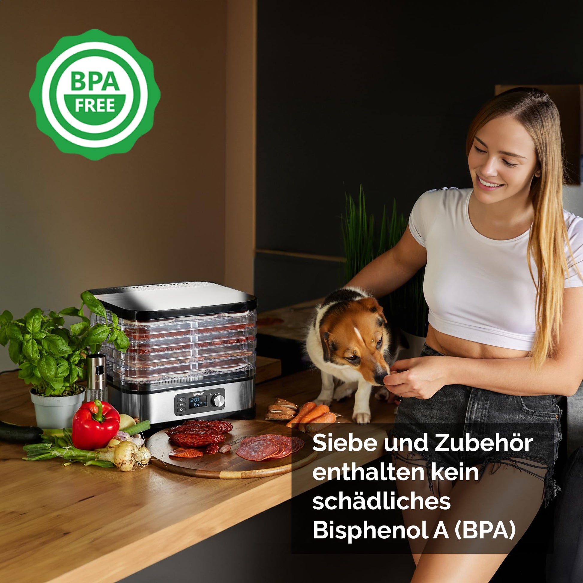 Ja, alle Teile, die mit Lebensmitteln in Berührung kommen, bestehen aus gesundheitlich unbedenklichem, BPA-freiem Kunststoff. Die Reinigung ist sehr komfortabel: Das Gehäuse aus gebürstetem Edelstahl kann einfach abgewischt werden und die Dörrsiebe sowie das Zubehör sind spülmaschinengeeignet.