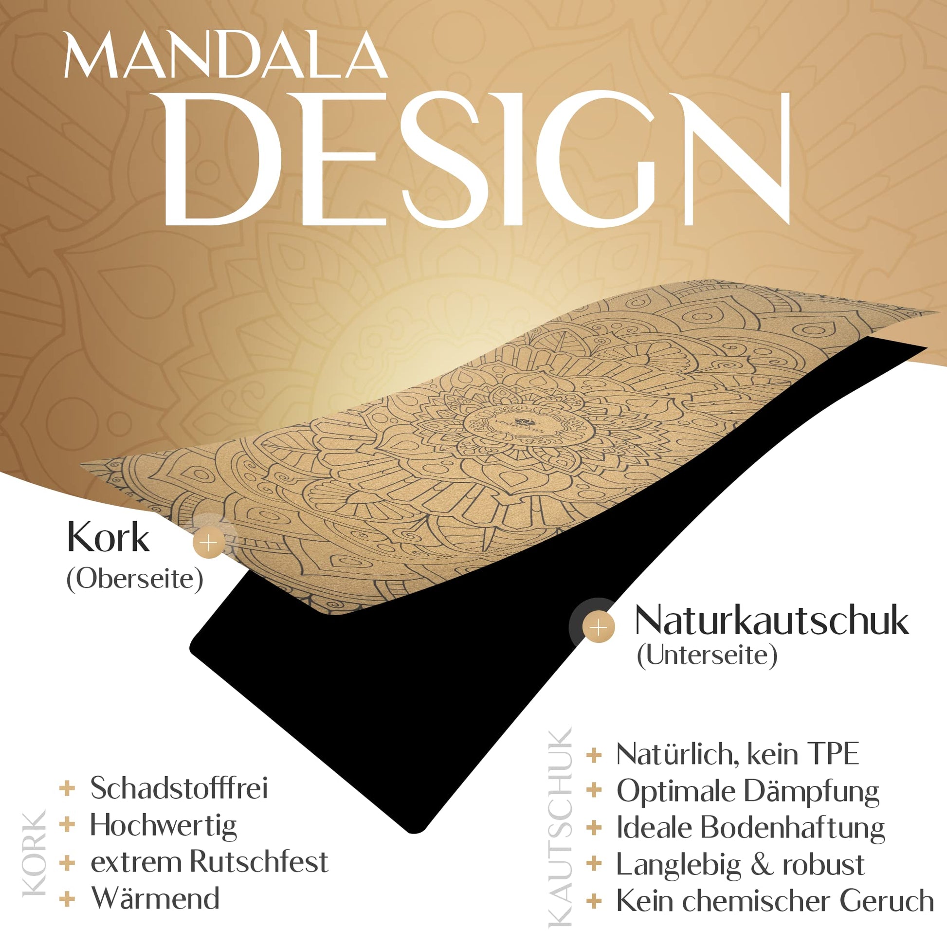 - Materialien: Oberfläche aus 100% nachhaltigem Kork, Unterseite aus natürlichem Kautschuk.