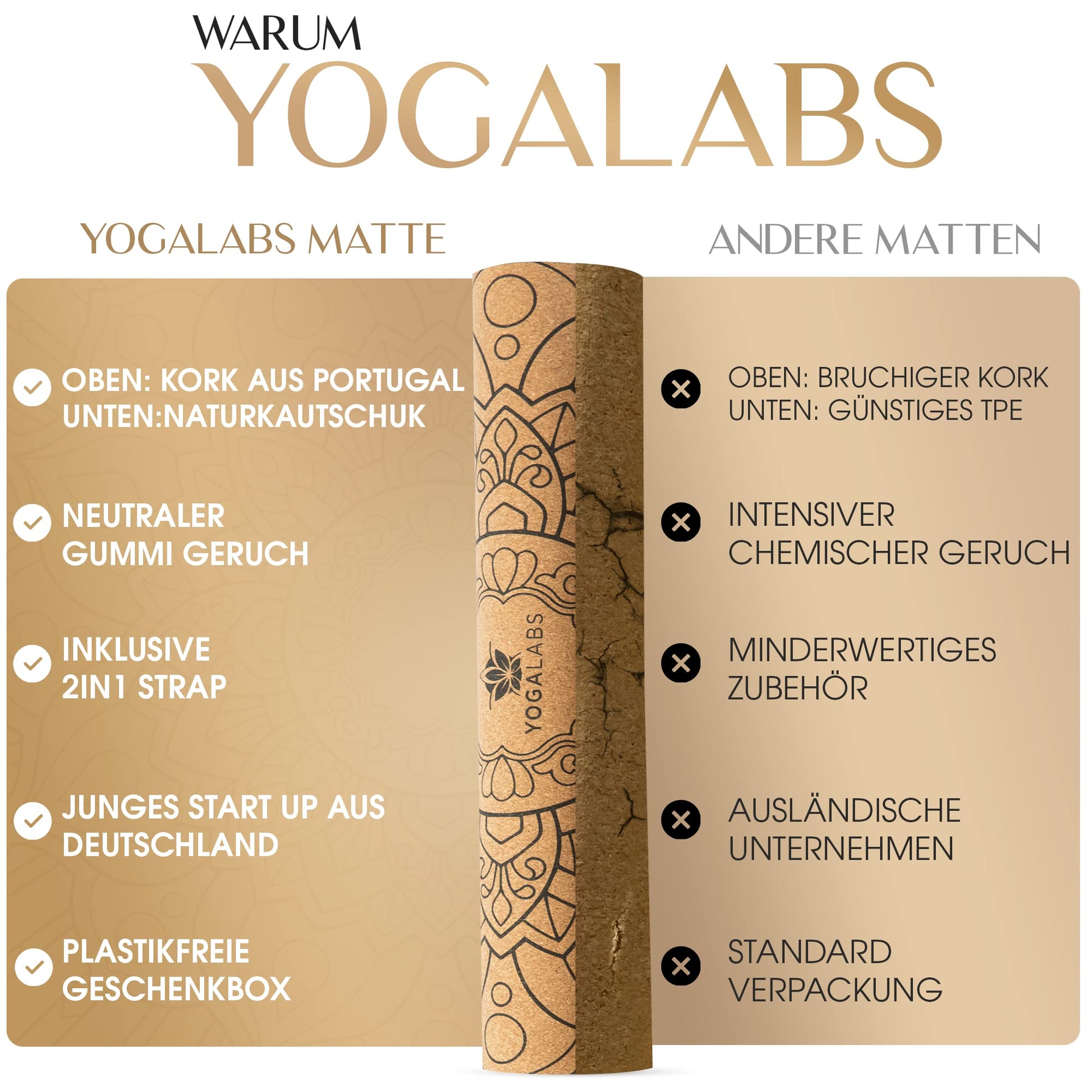 YOGALABS® 2in1 Yogamatte - Kork & Naturkautschuk 183x61x0,4cm