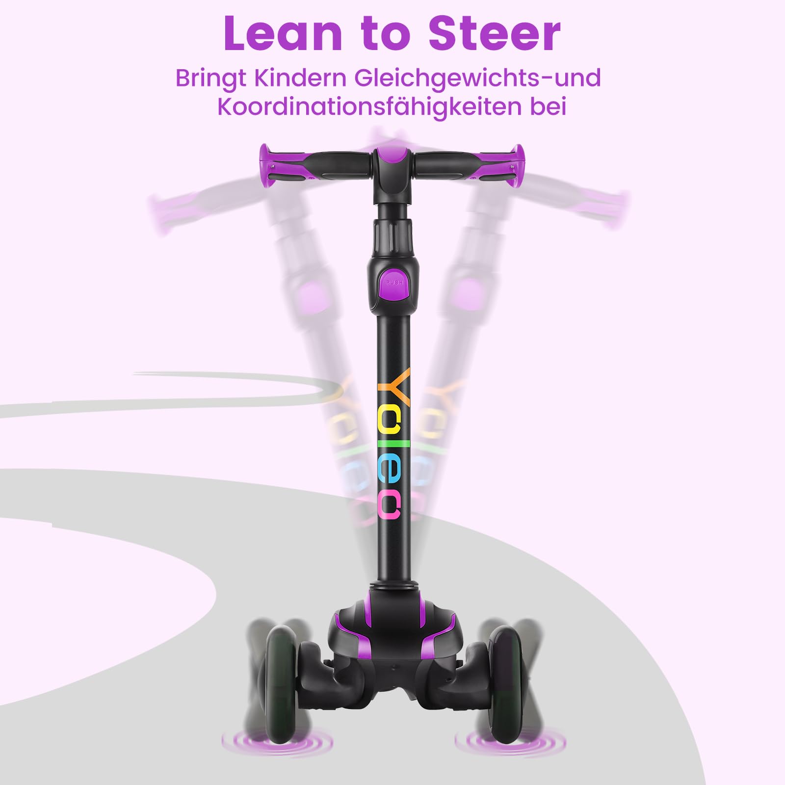 - Leuchtende Räder: Sobald sich der Roller bewegt, beginnen die drei Räder in bunten Farben zu blinken. Dieses coole Feature sorgt für ein einzigartiges Fahrerlebnis und macht jede Fahrt zu einem Hingucker.