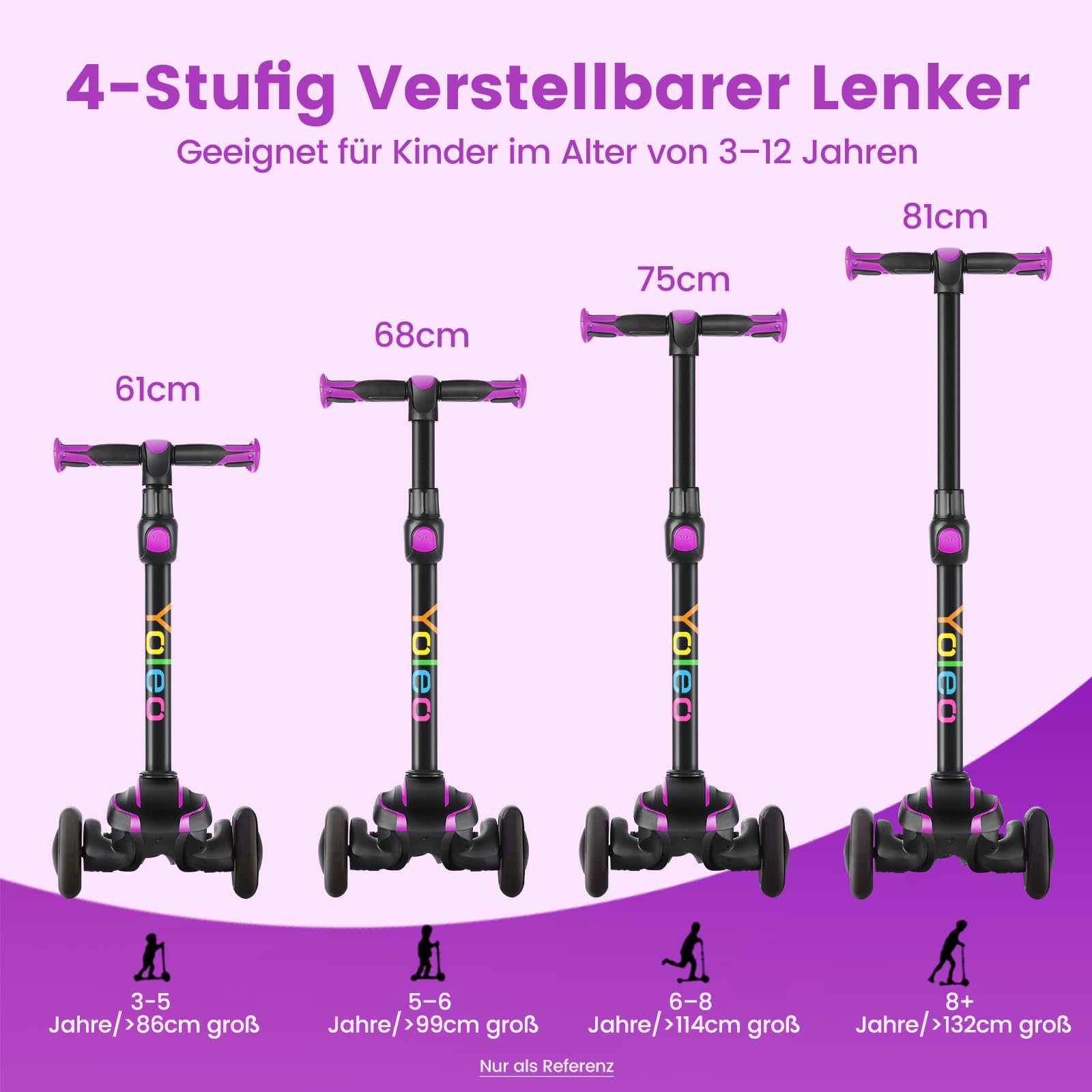 Ja, der Roller ist ideal für Kinder von 3 bis 12 Jahren. Die Lenkstange lässt sich einfach in 4 Stufen von 61 cm bis 81 cm verstellen und passt sich so perfekt an die Grösse Ihres Kindes an, was eine jahrelange Nutzung ermöglicht.