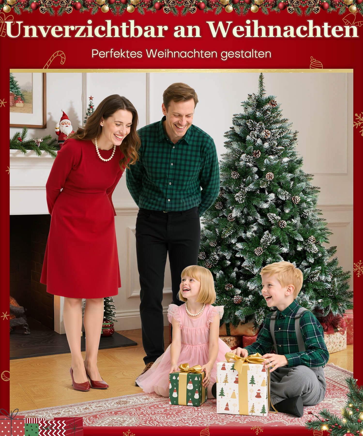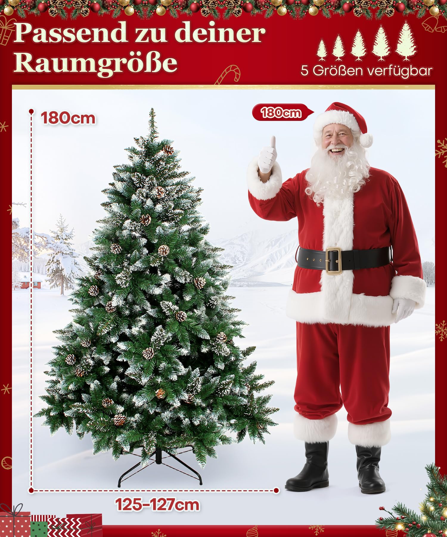 - Authentisches Design: Die Nadeln sind mit einem weissen Schneepulver-Effekt versehen und mit echten Kiefernzapfen dekoriert, was dem Baum ein besonders naturgetreues Aussehen verleiht.