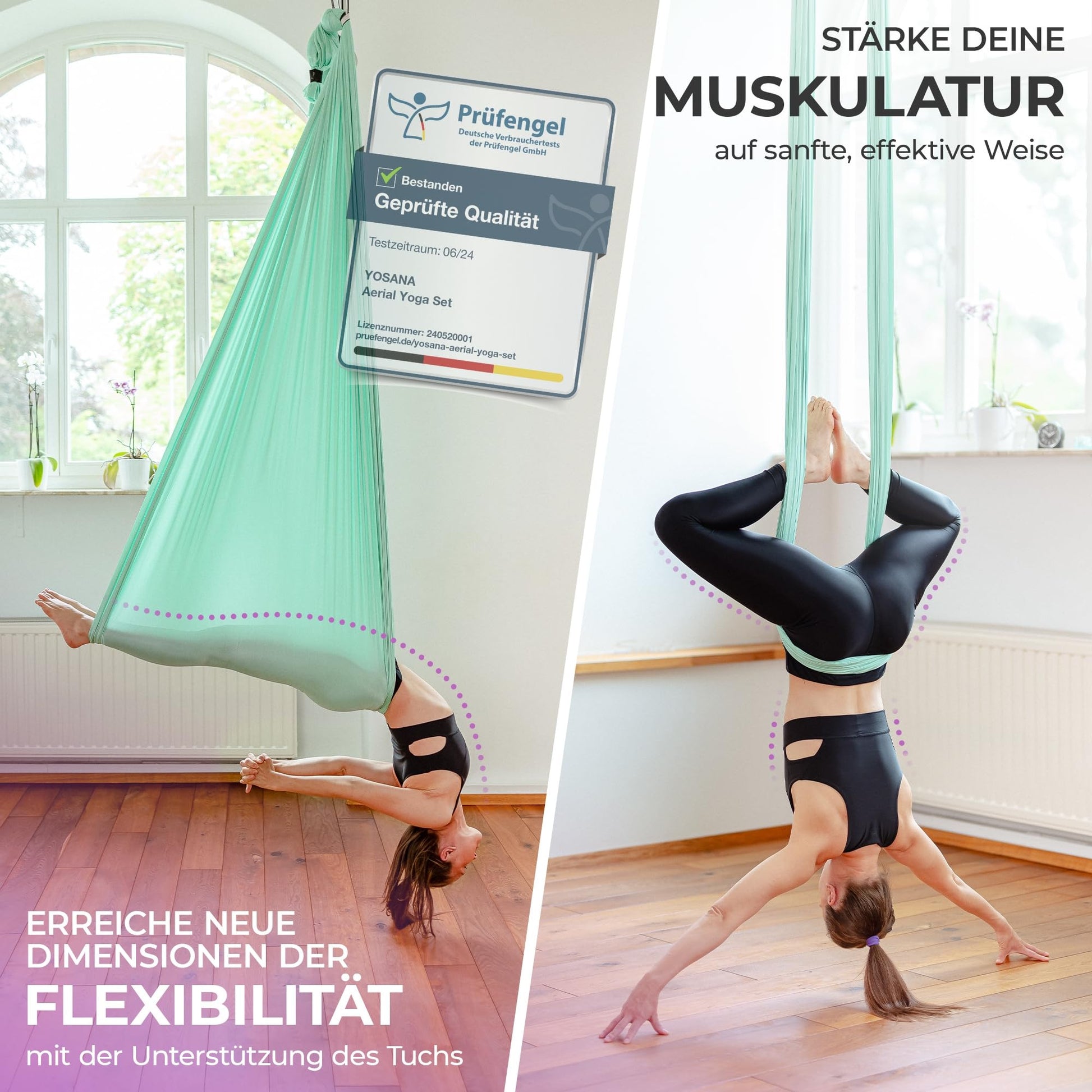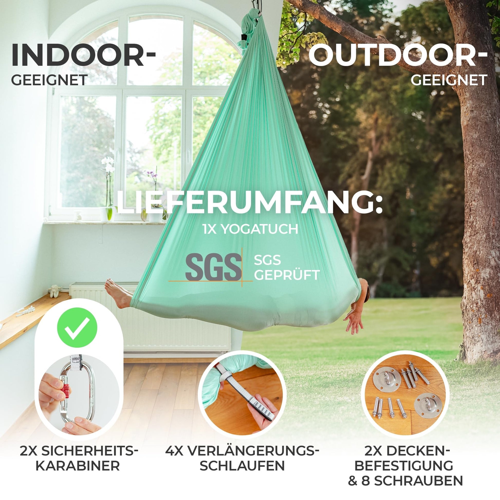 Entdecken Sie das Yosana Hängematten-Set, Ihre allumfassende Lösung für Entspannung und Aerial Yoga. Dieses Paket enthält alles, was Sie für eine sichere und unkomplizierte Montage benötigen, um sofort mit Ihrem Schwebeerlebnis zu beginnen.