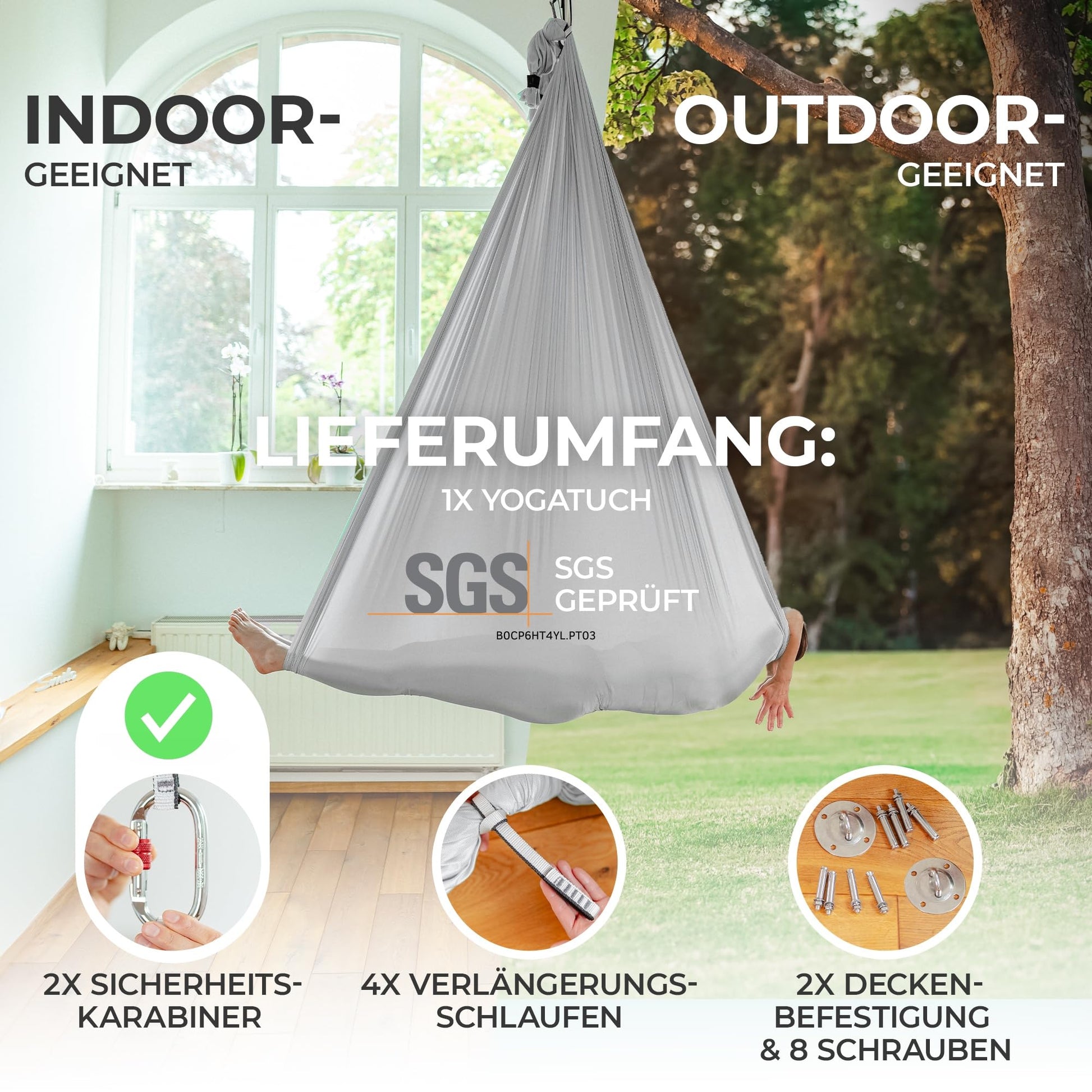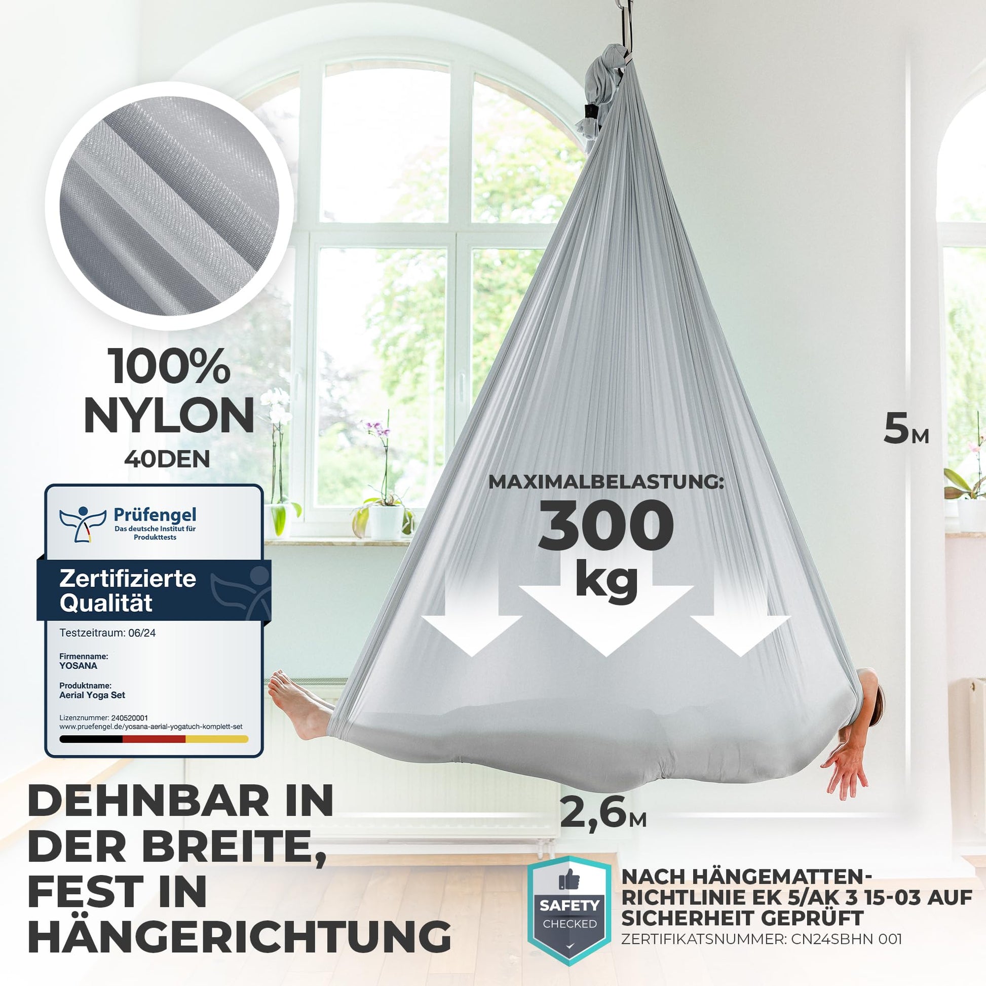 Sicherheit steht an erster Stelle. Das Tuch aus 40-Denier-Nylon ist vom TÜV Rheinland geprüft und für eine maximale Belastbarkeit von 300 kg zertifiziert. Das gesamte Zubehör, inklusive Karabiner und Schlingen, wurde zusätzlich vom unabhängigen Labor SGS auf Belastbarkeit getestet, damit Sie sorgenfrei trainieren können.