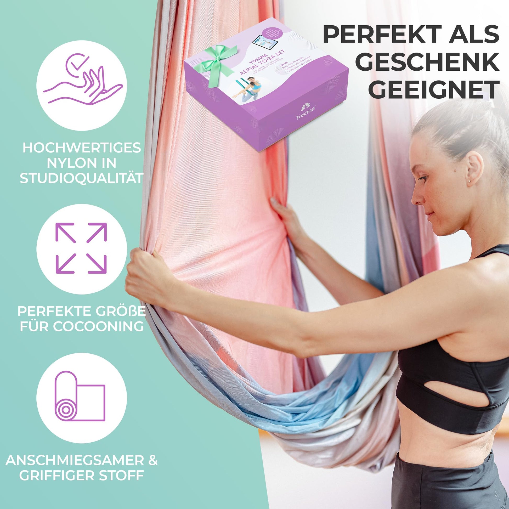 - Ideale Grösse: Mit einer Länge von 5 Metern (nicht dehnbar) und einer Breite von 2,6 Metern (dehnbar) bietet das Tuch grosszügig Platz für alle Übungen.