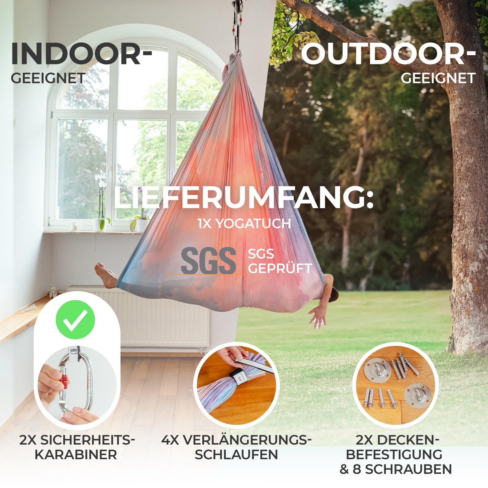 Ja, dieses Komplettset ist ein Rundum-sorglos-Paket. Es enthält das 5 Meter lange Nylontuch, zwei Deckenbefestigungen, acht Sicherheitsschrauben, zwei Karabiner sowie vier Verlängerungsschlingen zur Höhenanpassung. Sie müssen keine zusätzlichen Teile kaufen.
