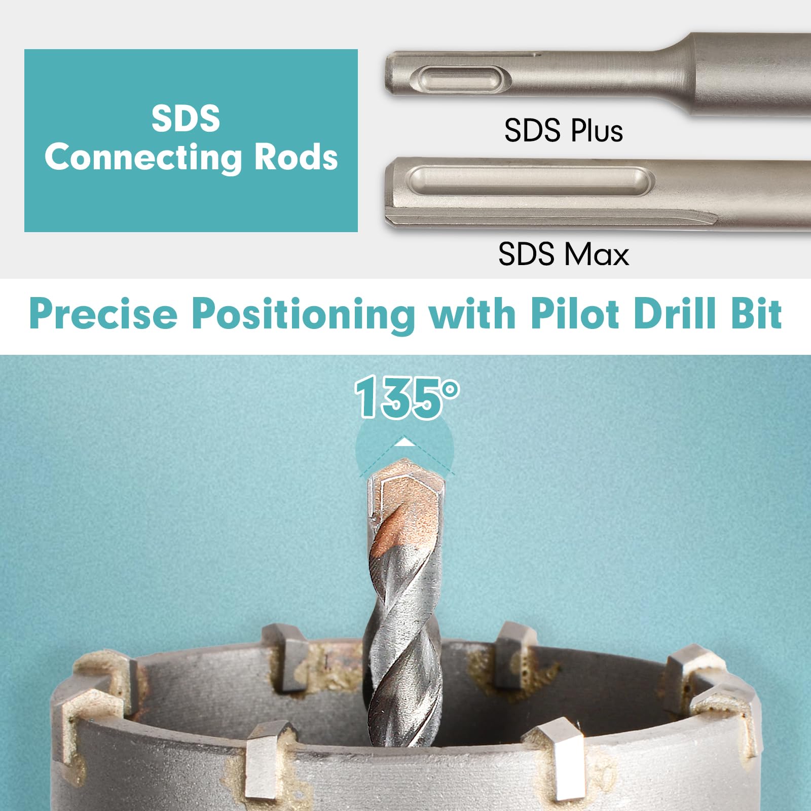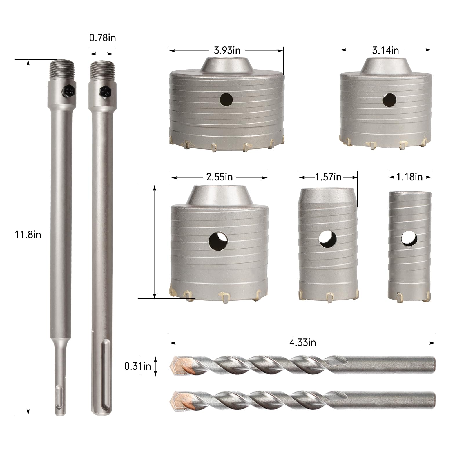 - Komplettes Set: Beinhaltet 5 Kronenbohrer (Ø 30, 40, 65, 80, 100 mm), 2 Zentrierbohrer und zwei 300 mm Aufnahmeschäfte für SDS Plus und SDS Max Systeme.
