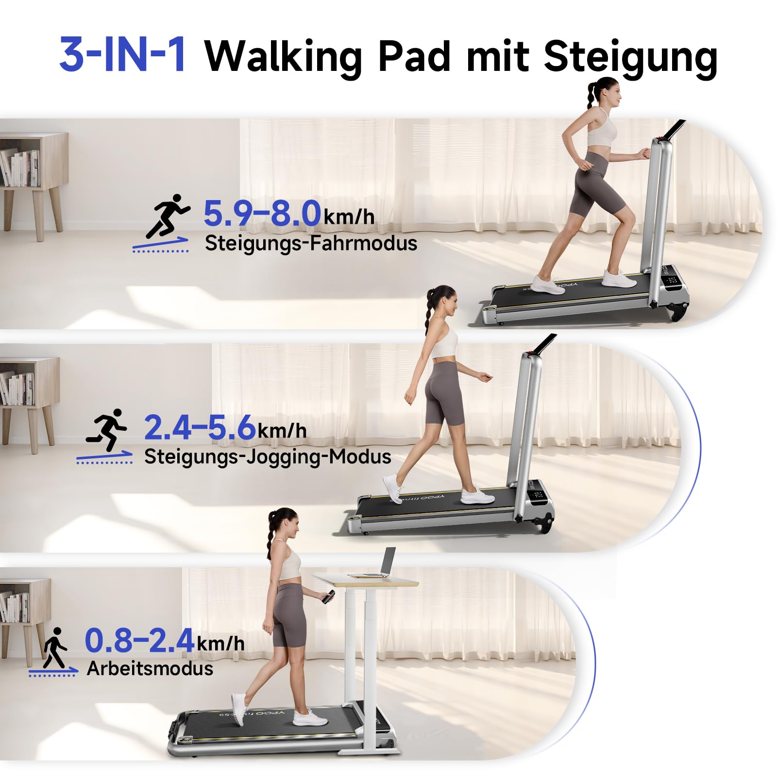 - Zwei Trainingsmodi: Wählen Sie zwischen dem Gehmodus (0.8–4 km/h) und dem Laufmodus (0.8–8 km/h), passend für Anfänger und Fortgeschrittene.