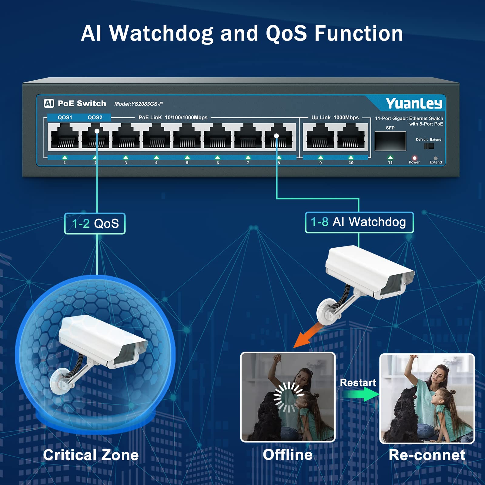 - Intelligente Netzwerkoptimierung: Die AI Watchdog-Funktion startet nicht mehr reagierende PoE-Geräte automatisch neu, was die Wartung vereinfacht. Zudem priorisieren die Ports 1-2 dank QoS (Quality of Service) wichtige Daten, um deren verlustfreie Übertragung bei hohem Datenaufkommen sicherzustellen.
