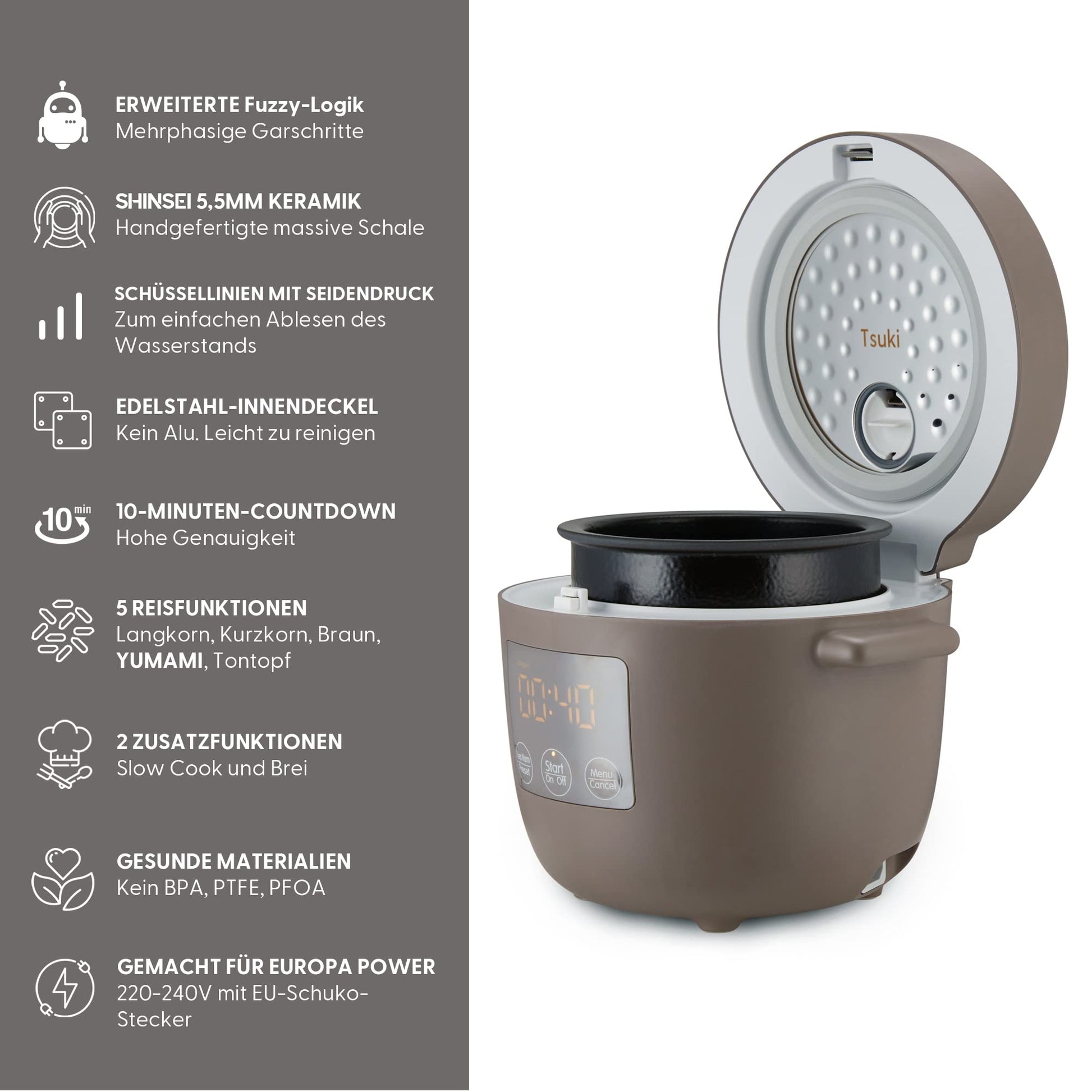 Der Tsuki bietet maximale Flexibilität mit einer 24-Stunden-Timerfunktion, mit der Sie Mahlzeiten im Voraus planen können. Nach dem Kochen schaltet er automatisch in den Warmhaltemodus, sodass Ihr Essen immer zur gewünschten Zeit servierbereit ist.