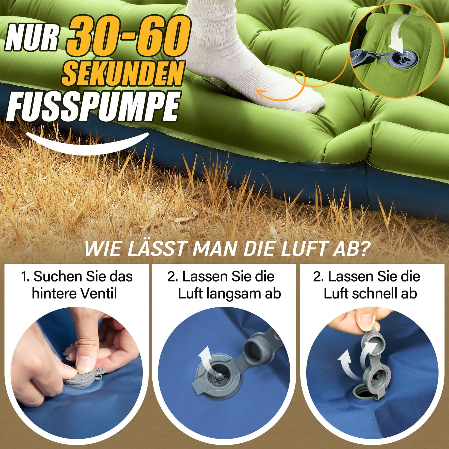 - Integrierte Fusspumpe: Schnelles Aufblasen in nur 30-60 Sekunden durch einfaches Treten – ganz ohne externe Pumpe oder Puste.