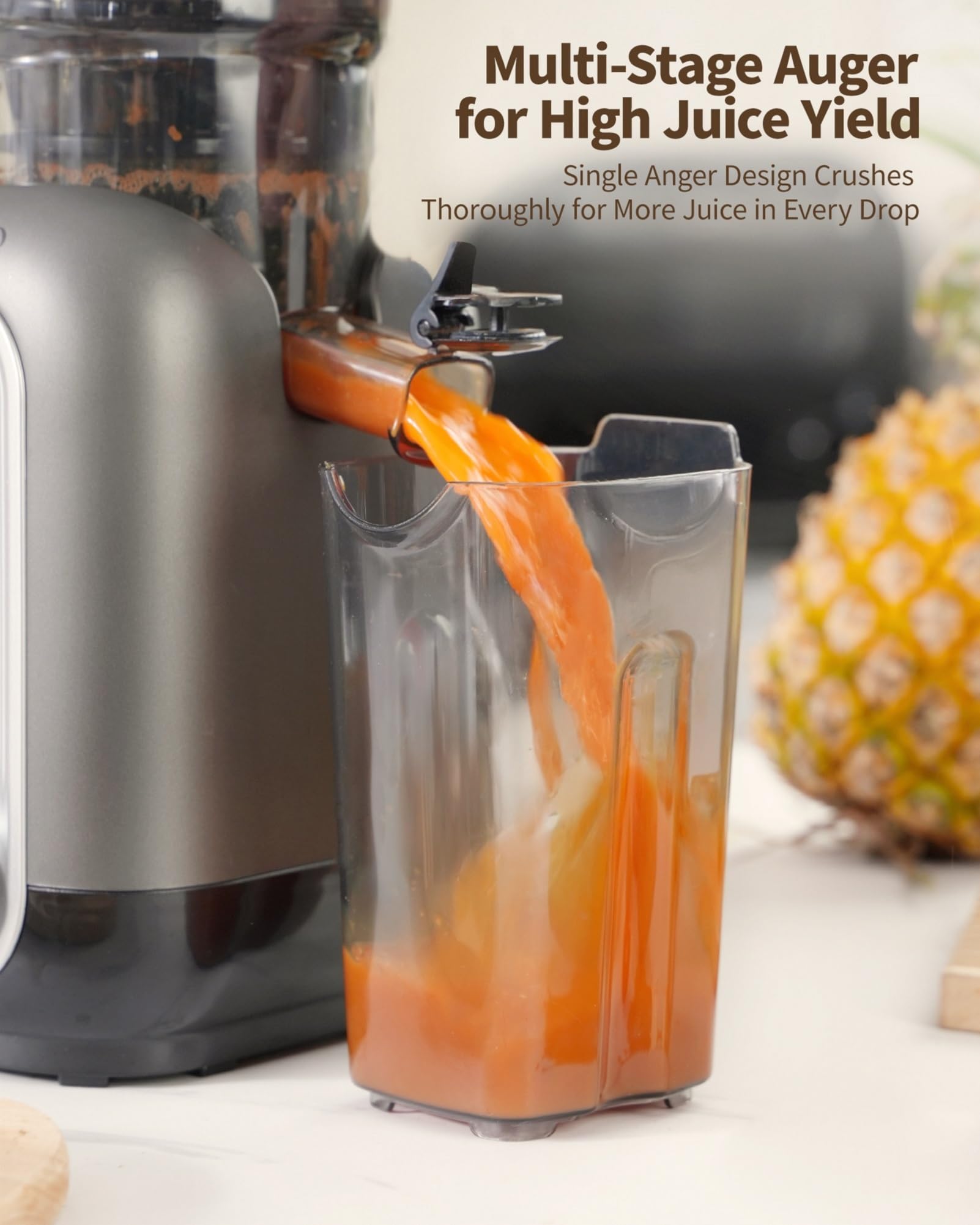 - Patentierte Pressschnecke: Eine verlängerte Schnecke greift die Zutaten effizient, zerkleinert Fasern gründlich und sorgt für eine maximale Saftausbeute mit trockenem Trester.