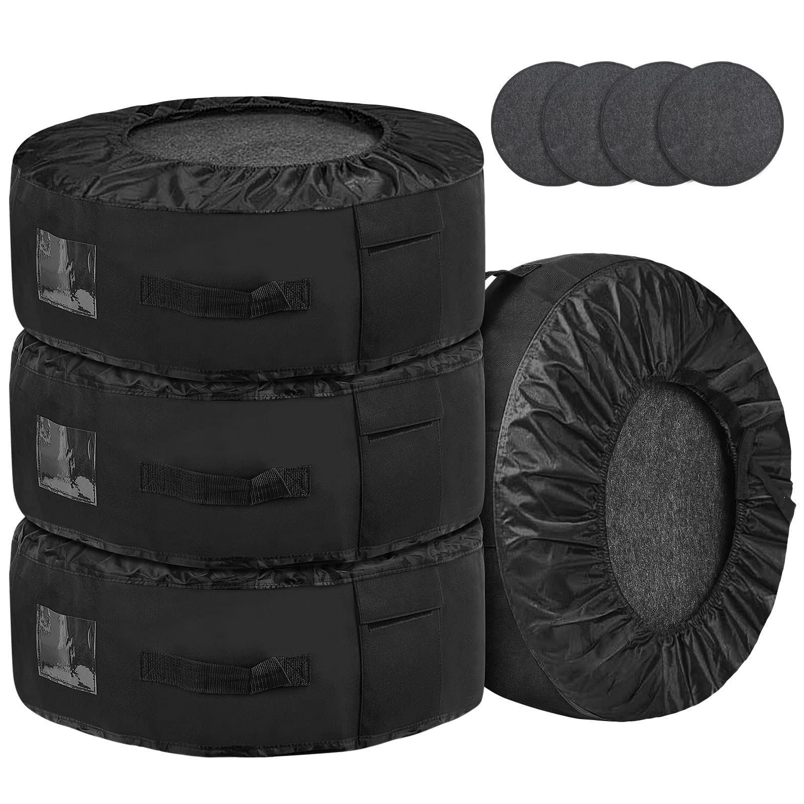 Das Set besteht aus 4 robusten Reifentaschen und 4 grossen Filz-Schutzpads mit 60 cm Durchmesser. Die Filzpads werden beim Stapeln einfach zwischen die Räder gelegt und verhindern so zuverlässig Kratzer an Ihren wertvollen Felgen.