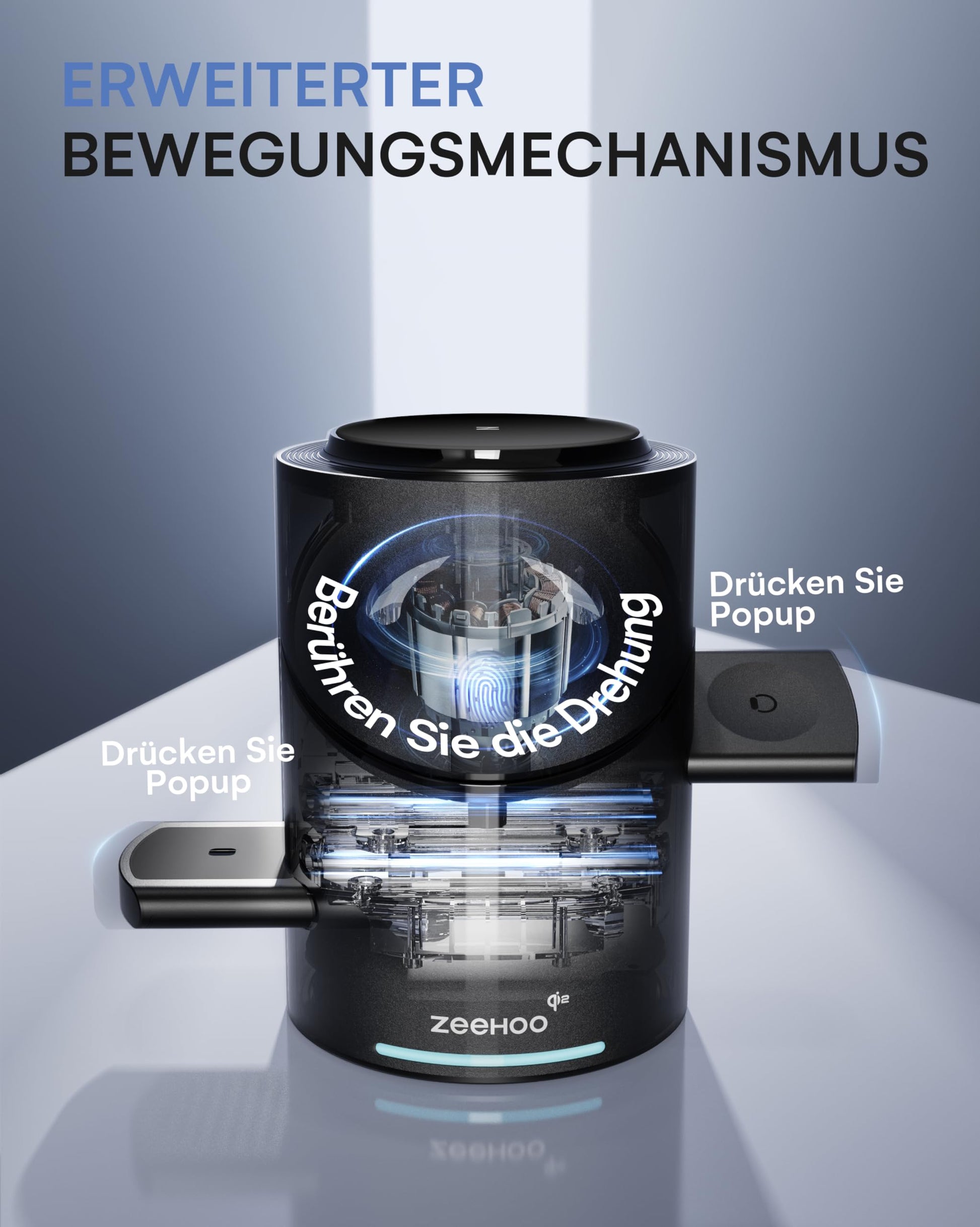 Verabschieden Sie sich von unzähligen Kabeln und Netzteilen. Diese Ladestation bündelt die Energie für Ihre wichtigsten Geräte an einem zentralen Ort und sorgt für Ordnung auf jeder Oberfläche. Dank der modernsten QI2-Technologie laden Sie Ihr iPhone mit maximaler Geschwindigkeit, während Apple Watch und AirPods ebenfalls zuverlässig mit Strom versorgt werden. Das durchdachte Design mit automatischer Rotation und ausklappbarer Ladefläche macht die tägliche Nutzung zum Kinderspiel. Ob auf dem Nachttisch oder im Reisegepäck – dieses Ladegerät ist der Inbegriff von Effizienz.