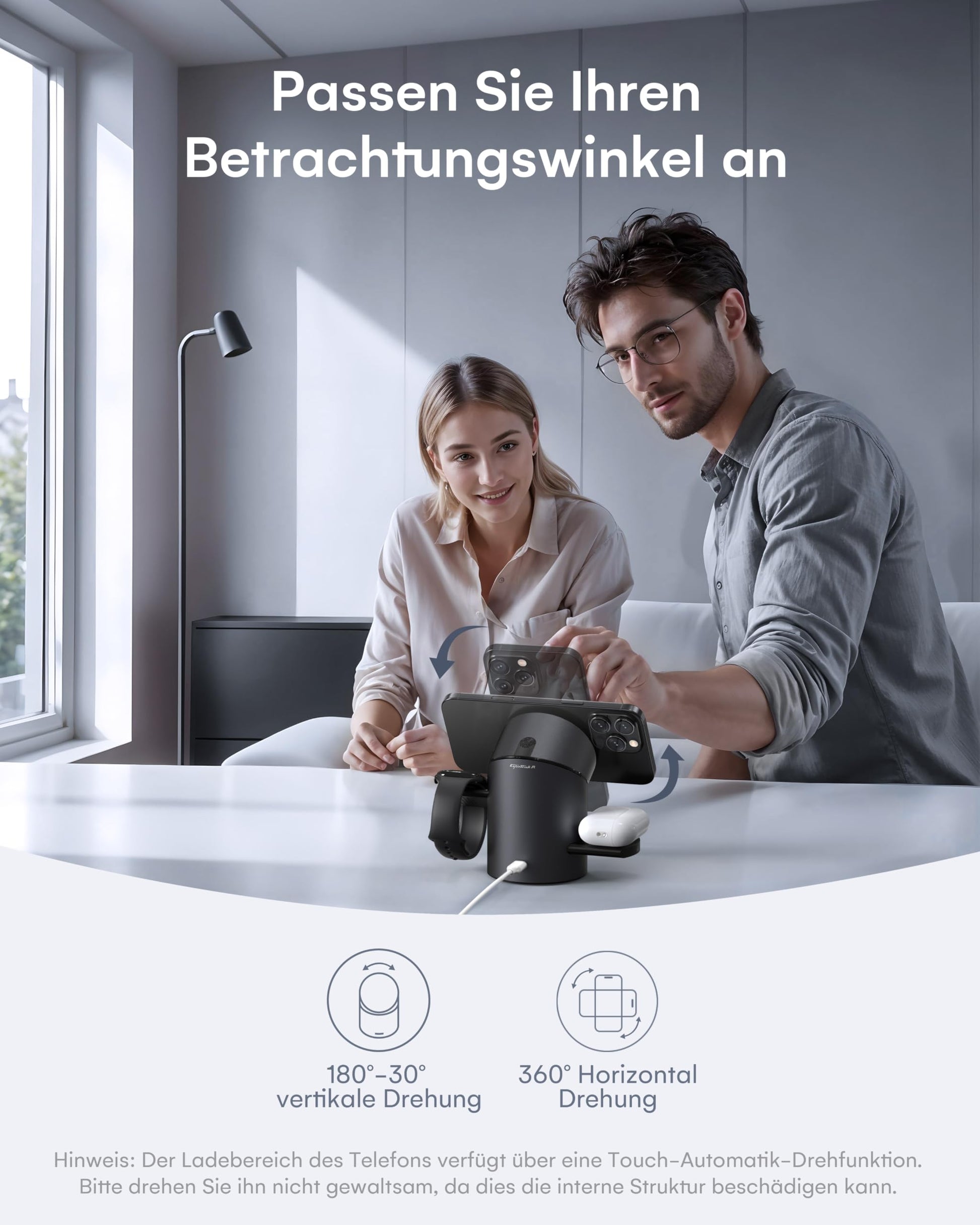 - Smarte Ladefunktionen: Die Station verfügt über eine automatisch rotierende Halterung für Ihr iPhone und eine clevere, ausklappbare Ladefläche für Ihre Apple Watch – für eine innovative und komfortable Handhabung.