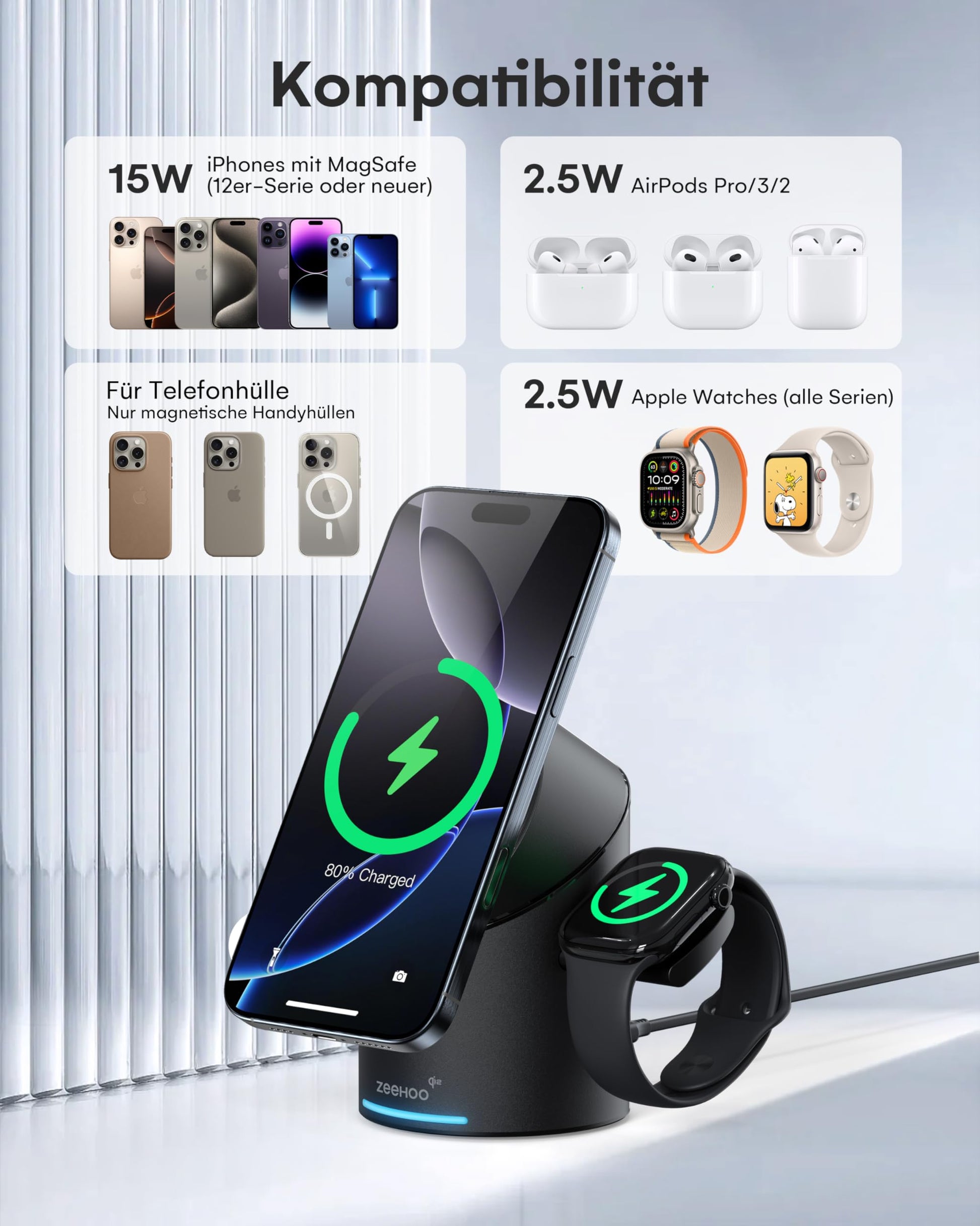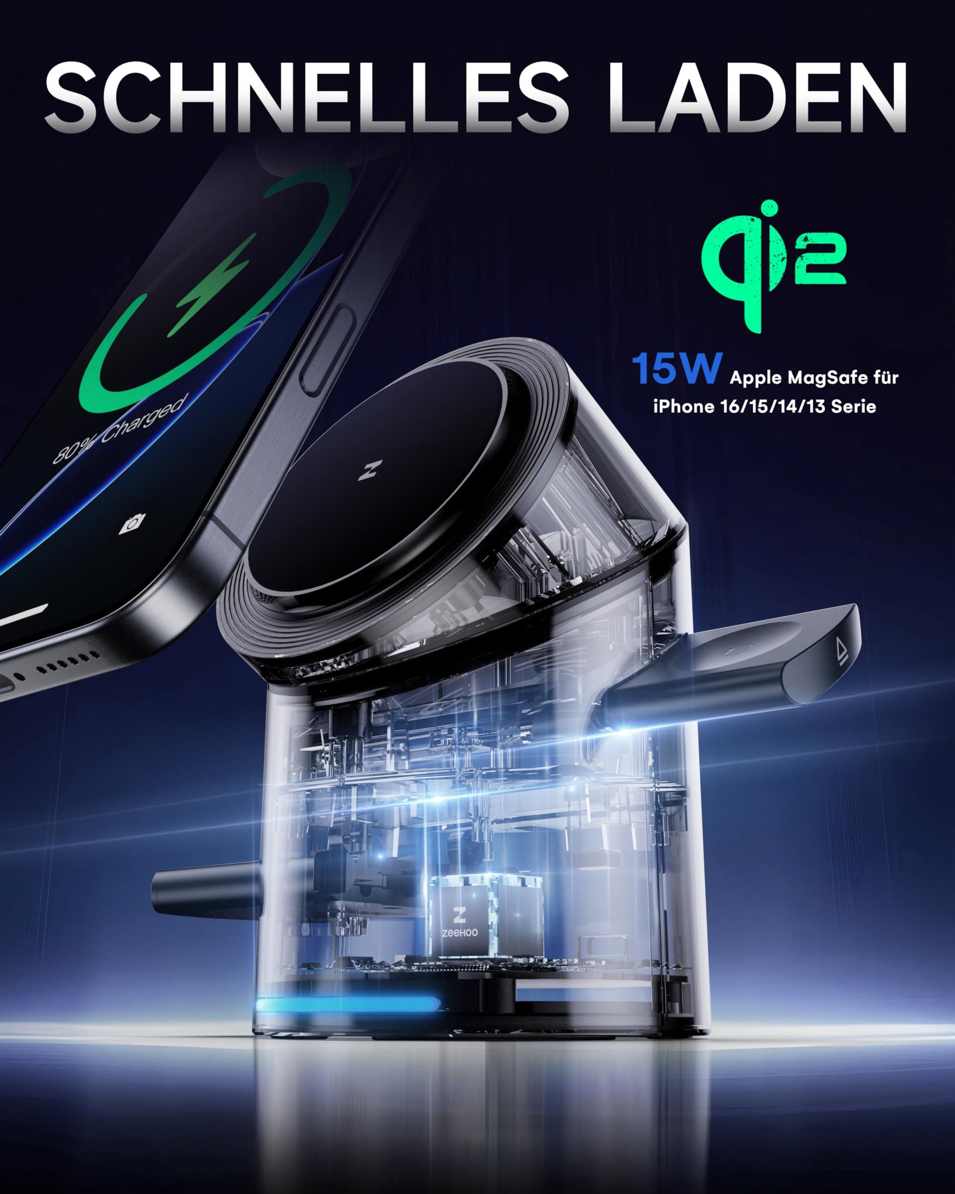ZEEHOO 3-in-1 Wireless Ladestation Apple MagSafe QI2 15W