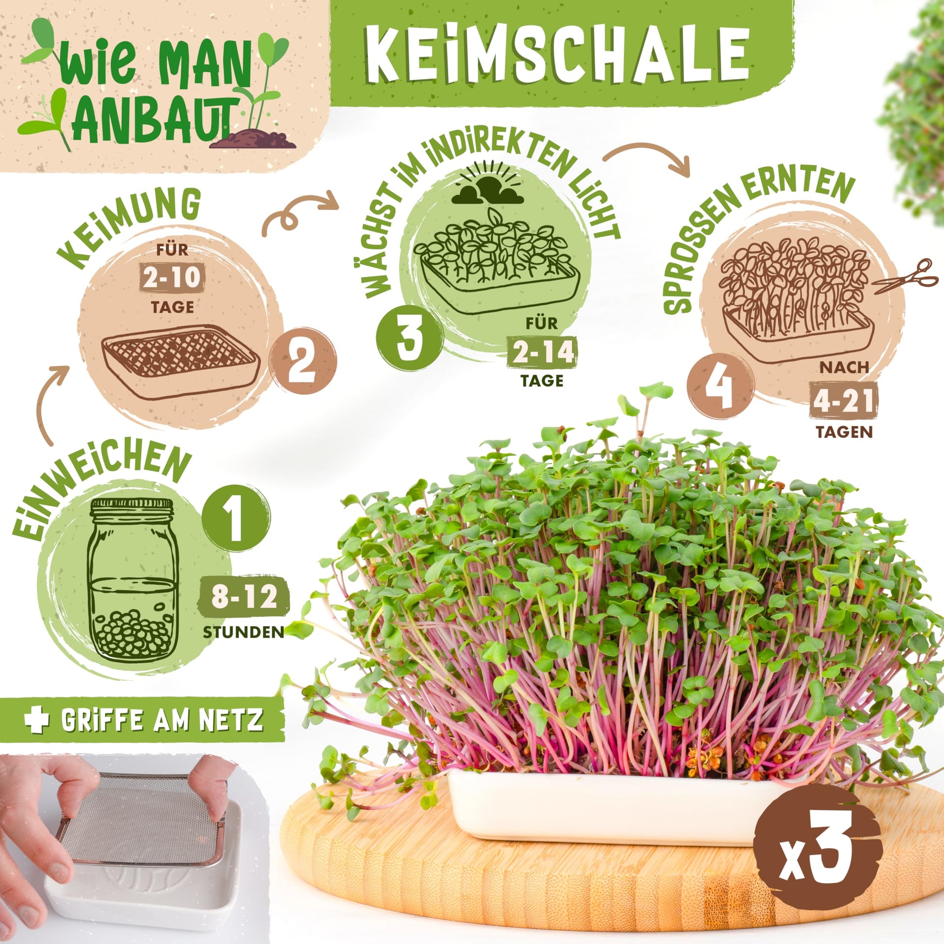 - Innovatives 2-in-1-Design: Jedes Set enthält eine zusätzliche Anzuchtschale (Kressesieb), ideal für Microgreens und spezielle Sprossensorten.
