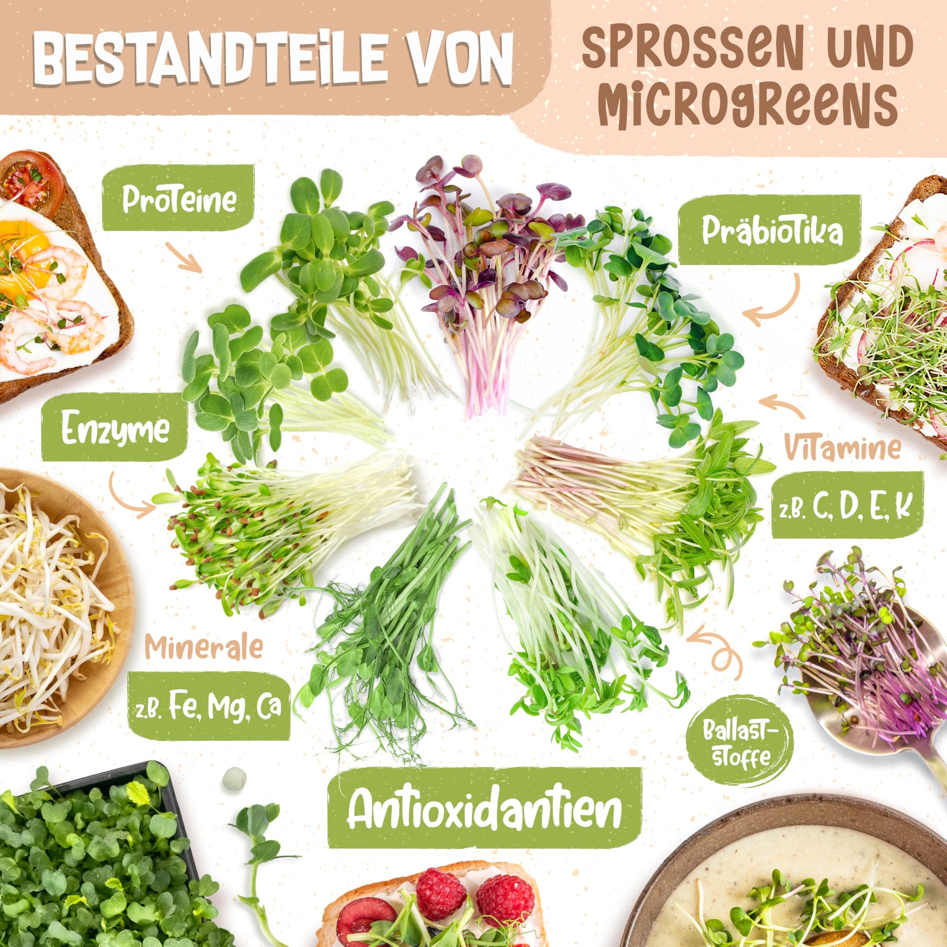 Das clevere 2-in-1-Design ermöglicht maximale Vielfalt. Im Glas können Sie klassische Sprossen wie die mitgelieferten Mungbohnen und Radieschen ziehen. Die zusätzliche Anzuchtschale (Kressesieb) ist ideal für Microgreens oder Kresse, die in einer Schale besser gedeihen.