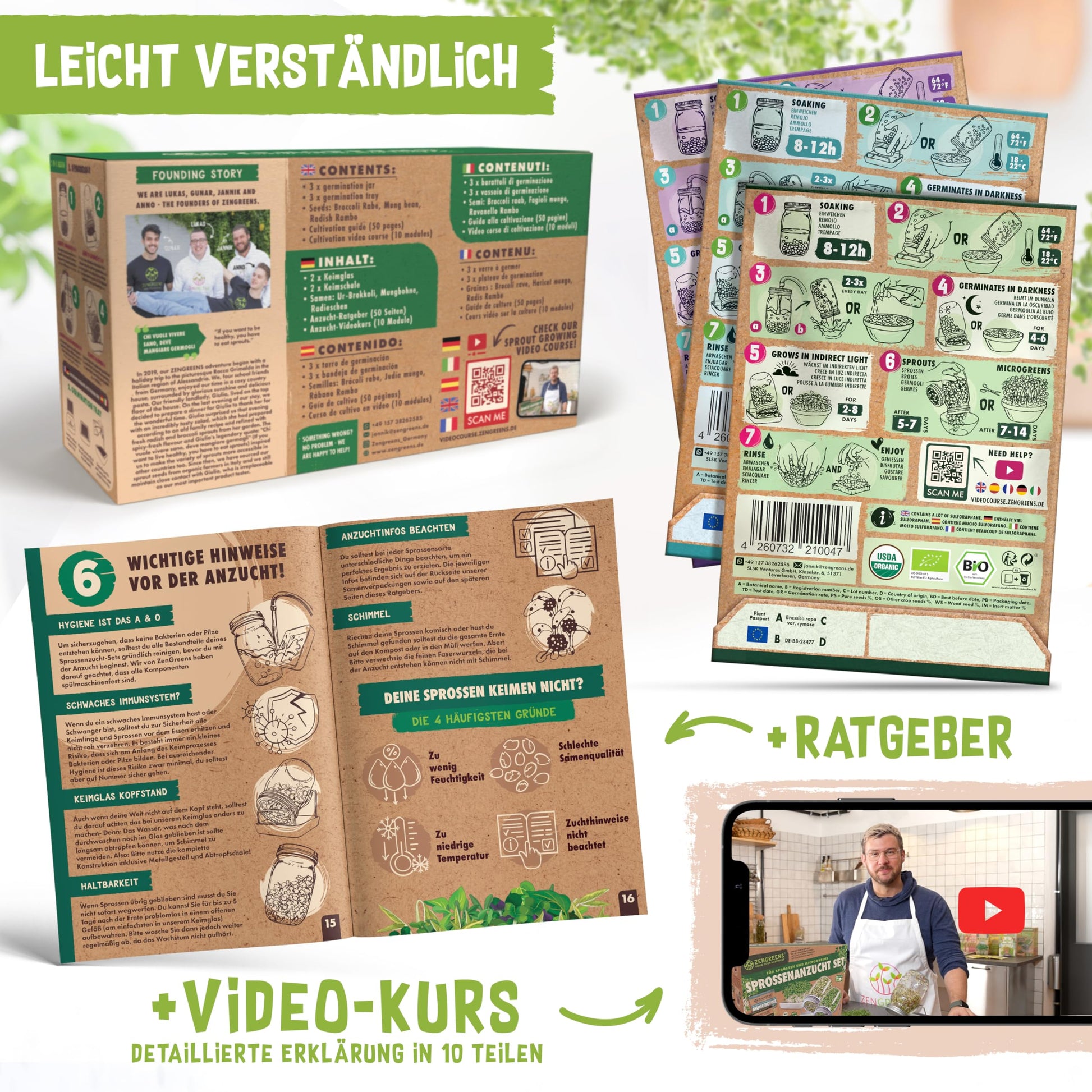 Das Komplett-Set beinhaltet alles für den sofortigen Start: Je nach Wahl ein, zwei oder drei Keimgläser mit Halterung, eine innovative 2-in-1-Anzuchtschale (Kressesieb), eine Auswahl an Bio-Saatgut (Ur-Brokkoli, Mungbohnen, Radieschen) sowie exklusiven Zugang zu einem 10-teiligen Videokurs und einem 50-seitigen Ratgeber.