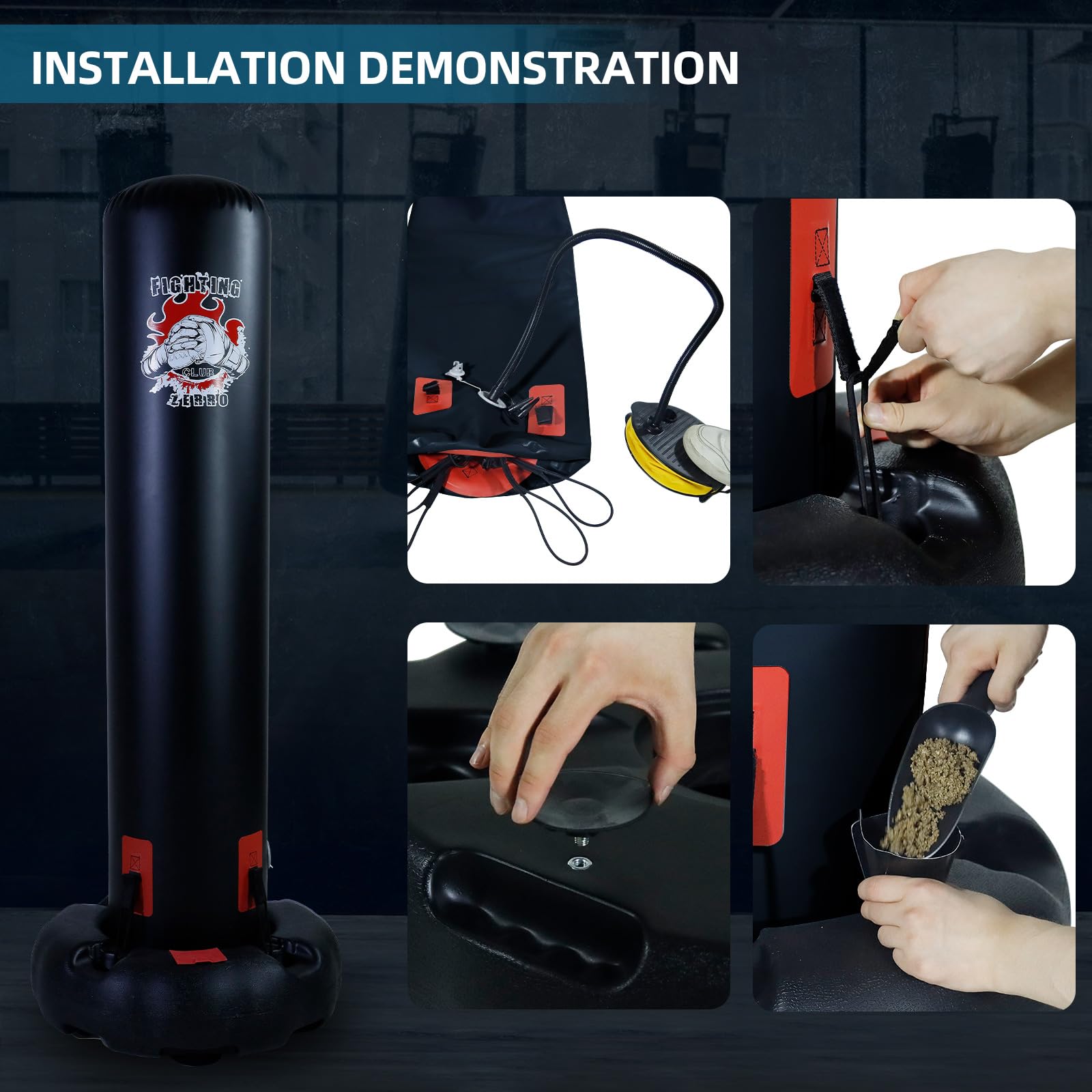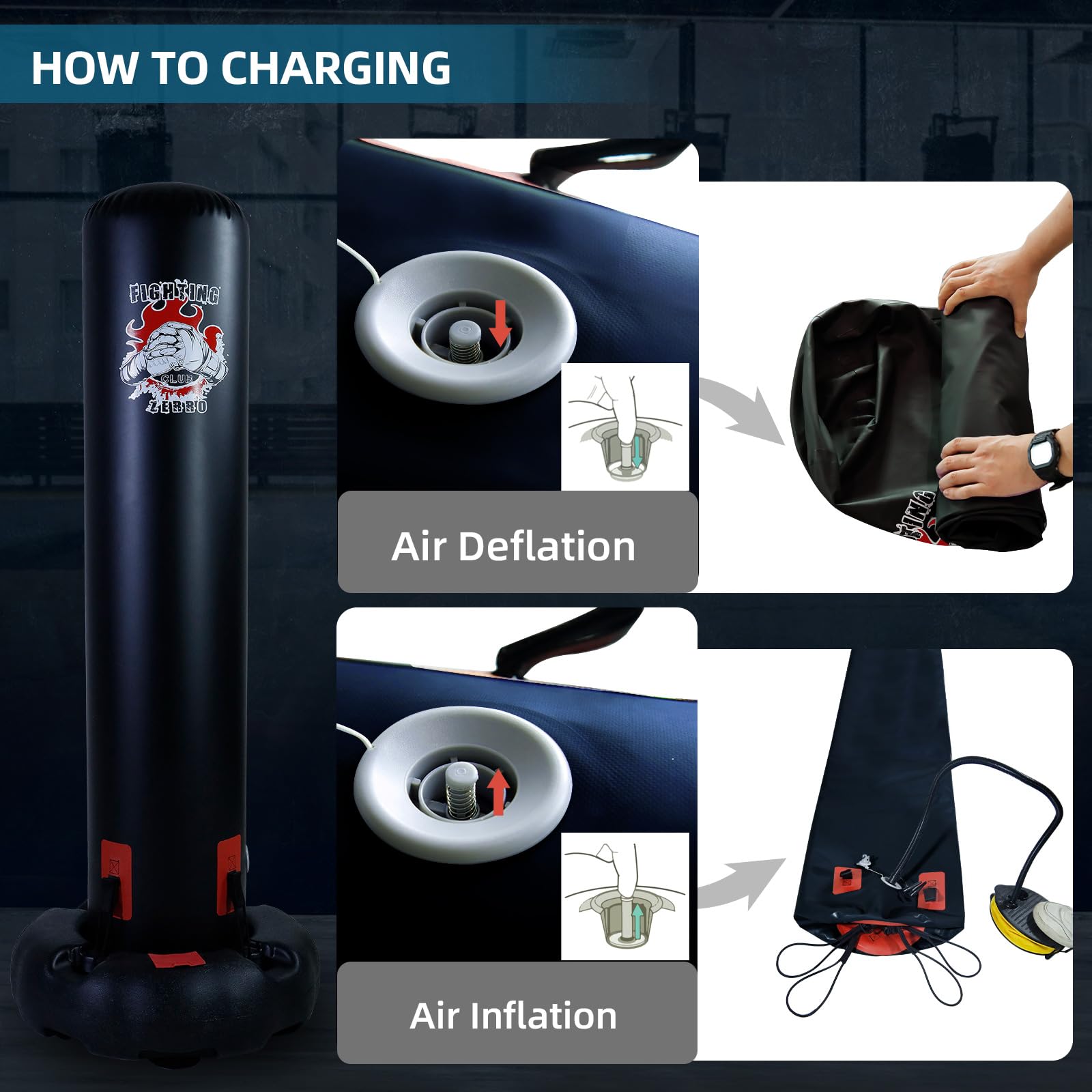 Entdecken Sie den freistehenden, aufblasbaren Boxsack von ZERRO – das ideale Trainingsgerät, um sich fit zu halten, Stress abzubauen oder einfach Spass an der Bewegung zu haben.
