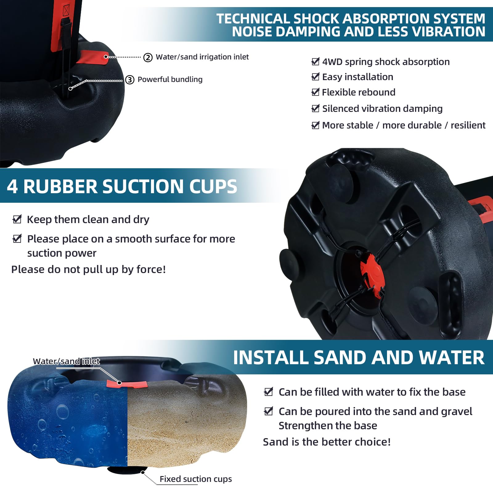 - Stabiler Standfuss: Die Basis kann für maximale Stabilität mit Wasser oder Sand befüllt werden und verfügt über vier starke Saugnäpfe, die auf glatten Böden für sicheren Halt sorgen.