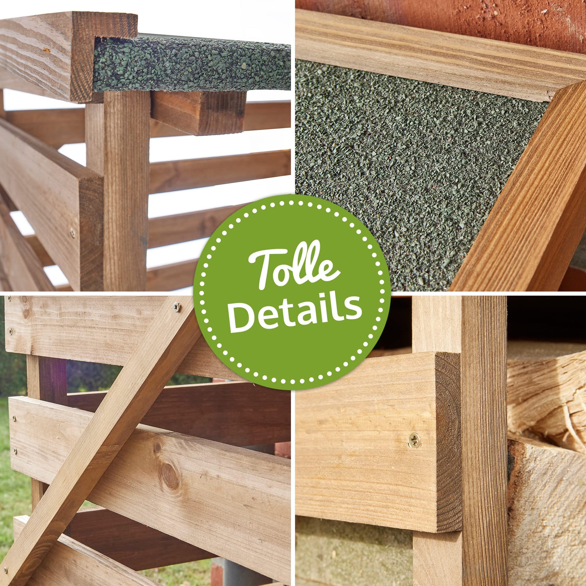 - Schützendes Dach: Ein abgeschrägtes Bitumendach leitet Regen und Schnee zuverlässig ab und hält Ihr Holz trocken.